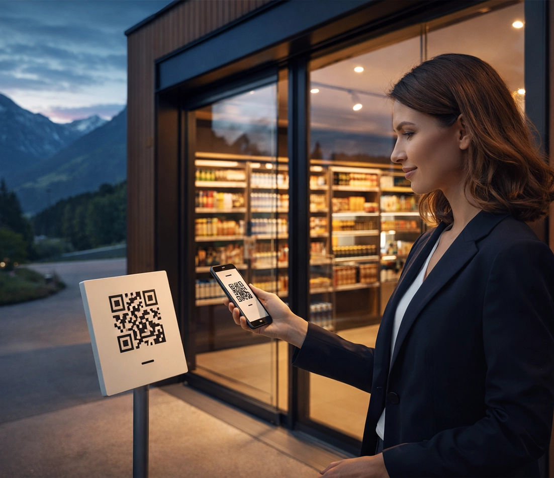 Das Entrify System ermöglicht einen vollständig autonomen Verkaufsprozess – vom Zutritt bis zur Bezahlung. Kundinnen und Kunden scannen am Eingang einen QR-Code, verifizieren kurz ihre Zahlungsmethode und erhalten automatisch Zugang. Im Store wählen sie ihre Produkte, scannen die Barcodes mit dem Smartphone und bezahlen bargeldlos über die hinterlegte Zahlungsmethode. Der digitale Beleg wird automatisch erstellt.